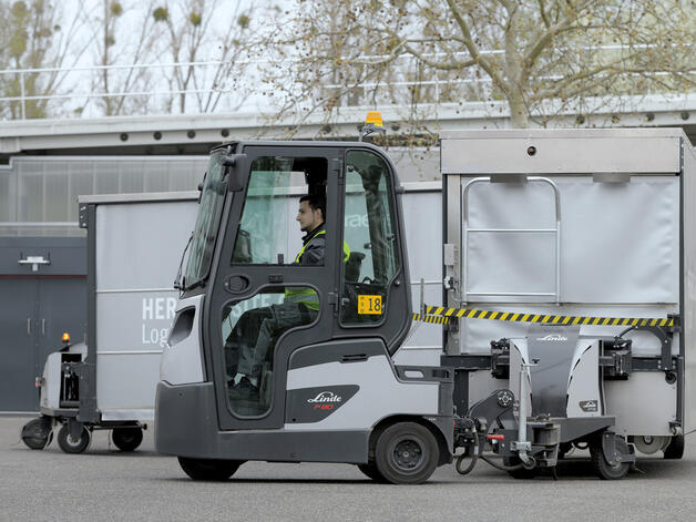 The suitable towing vehicles for the load train Factory Train are from the Linde P50 to P350 series of tow tractors. Other tractor manufacturers and types are also possible after testing. The vehicles will be converted to the Factory Train use accordingly and receive, among other things, a central operator terminal for the load train Factory Train.